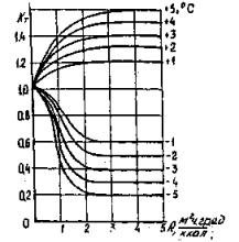 Рис. Номограмма для определения коэффициента КТ при расчете конечных глубин промерзания и оттаивания теплоизоляционного грунта (по Ю.С. Палькину); цифры на кривых - температура грунта на глубине годовых нулевых амплитуд