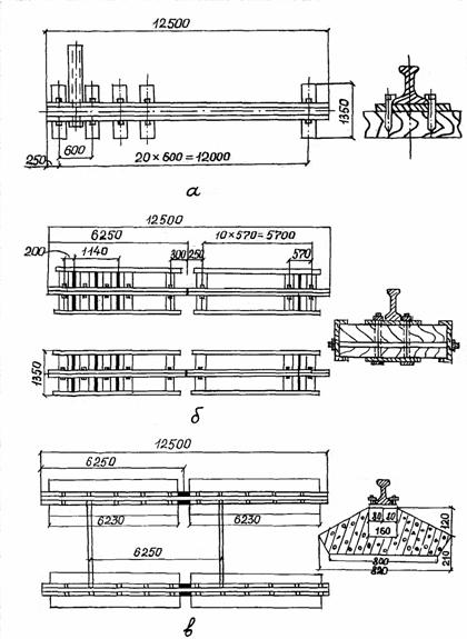 Рис. 1 Инвентарные секции рельсовых путей: а - с деревянными полушпалами; б- из деревометаллических звеньев; в - с железобетонными балками