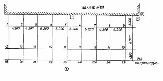 Приставляя нивелирную рейку к стене, определяют взятием отсчета расстояние от створа до стены. Так же определяют расстояние до ближайших граней основания подъемника. Далее, повернув зрительную трубу на 90°, с помощью рулетки определяют расстояние от ее коллимационной плоскости до ближайших граней основания подъемника и осей здания (на рис. 18 оси 9 и 10).