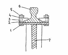 1 - болт, 2 - шайба, 3 - планка, 4 - пружинная шайба, 5 - гайка, 6 - подкрановый рельс, 7 - металлическая подкрановая балка