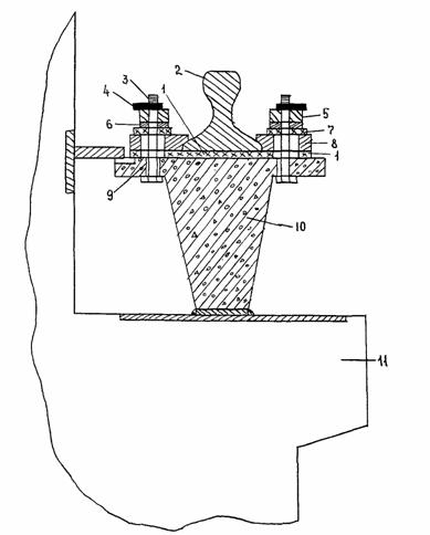 1 - упругая прорезиненная лента, 2 - рельс, 3 - болт, 4 - шпилька, 5 - гайка, 6 - шайба (пластина), 7 - упругая прорезиненная прокладка, 8 - лапка, 9 - металлическая трубка, 10 - подкрановая балка, 11 - колонна