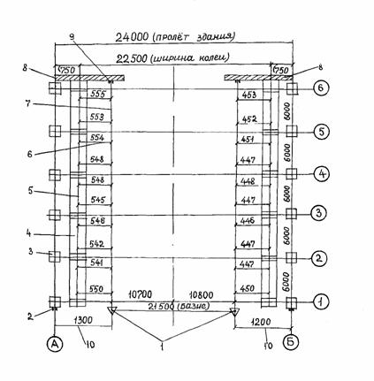 - расстояние от продольной оси колонн до оси катков крана должно быть 750 мм для кранов грузоподъемностью до 50 т и 1000 мм для кранов большей грузоподъемности;