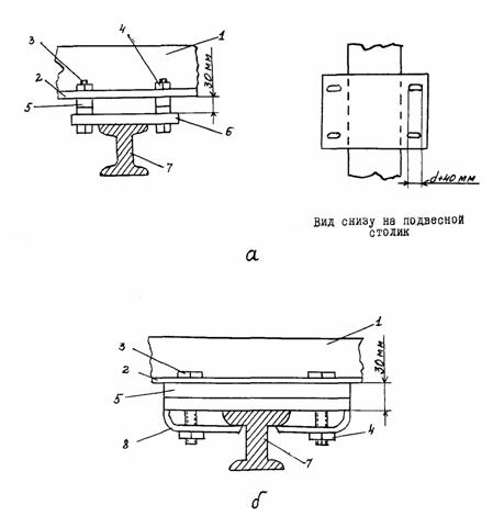 Рис. 14. Крепление подвесных крановых путей и монорельсов: а - на подвесном столике, б - на прижимных лапках;