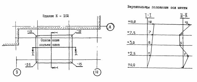 Рис. 19. Исполнительная схема вертикальности мачты подъемника и высотного положения его основания (показаны в мм условные отметки от горизонта, абсолютная отметка которого равна 145,50, а в системе высот здания +1,000)