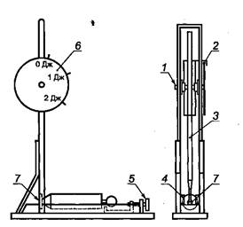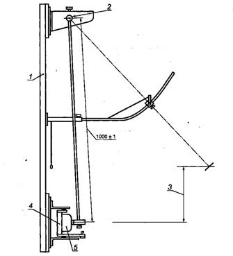 1 - корпус; 2 - штырь маятника; 3 - высота перемещения; 4 - монтажное приспособление; 5 - образец