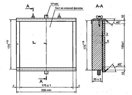 Образцы размещают на квадратном листе из клееной фанеры любой марки толщиной 8 мм со стороной 175 мм. Лист закреплен сверху и со стороны боковых граней при помощи жесткой крепежной скобы, являющейся частью крепежного приспособления, пример которого приведен на рисунке Г.3. Крепежное приспособление имеет массу (10± 1) кг и крепится на жесткой раме при помощи болтов. Рама, в свою очередь, фиксируется на твердой стене.