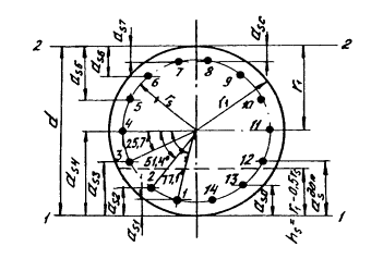 1.4. Расчетные площади сечений растянутой As и сжатой A's арматуры и соответствующие им положения центров тяжести as и a's устанавливаются по фактической площади каждого стержня и его месту нахождения в бетонном сечении. Это позволяет расширить область проектирования железобетонных элементов круглого сечения с различными диаметрами рабочих стержней при любом их расположении.