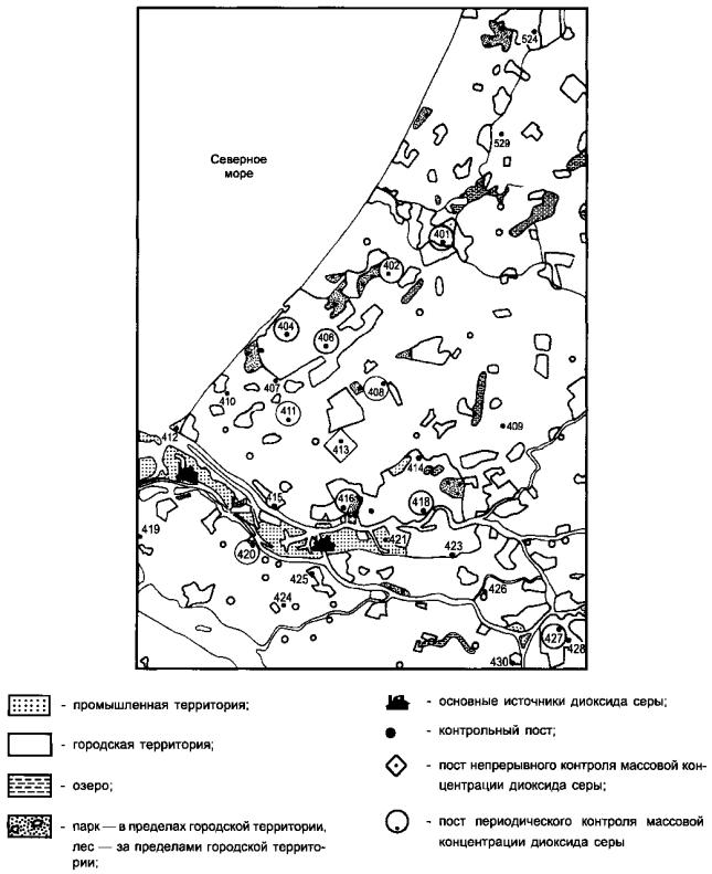 Рисунок В.2 - Топографическая карта местности с указанием размещения контрольных постов и основных источников выбросов диоксида серы