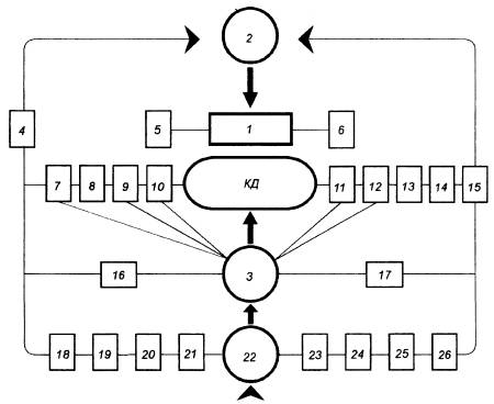 КД - конькобежная дорожка; 1 - трибуна для зрителей; 2 - входная группа, вестибюль, фойе для зрителей, буфеты для зрителей; 3 - раздевальные для спортсменов; 4 - помещение для пресс-центра; 5, 6 - ложи прессы и почетных гостей; 7 - помещение для судей; 8 - помещение для обслуживания занимающихся массовым катанием; 9 - помещения для инструктора и тренеров; 10 - помещение для сушки одежды и обуви; 11 - медицинские помещения; 12 - массажная и баня сухого пара; 13 - стоянка машин по уходу за льдом; 14 - бытовые помещения для рабочих; 15 - хладоцентр; 16 - зал 36×18 м для учебно-тренировочной работы; 17 - зал с тренажерами; 18 - администрация; 19 - буфет для спортсменов; 20 - помещение для отдыха спортсменов; 21 - методический кабинет; 22 - вестибюль для спортсменов; 23 - гардероб для спортсменов; 24 - буфет для спортсменов и сотрудников; 25 - технические помещения; 26 - пожарный пост.