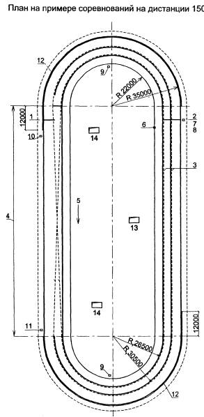 1 - зона безопасности; 2 - разминочная дорожка; 3 - направление гонки; 4 - старт на 500 и