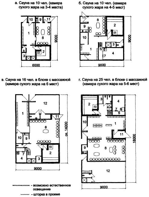 а - раздевалка от 3 до 6 мест, площадью от 15 до