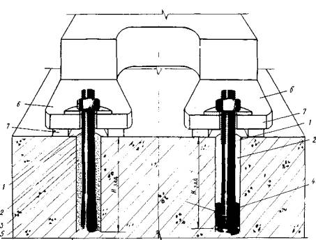 Глубина заделки зависит от ряда факторов (класса бетона, действующих нагрузок, расположения болтов и т.д.) и составляет 4-10 диаметров болта.