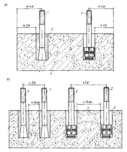 1.8. Допустимое расстояние от оси болта до края бетонного или железобетонного основания должно быть не менее (рис. 2,а):
