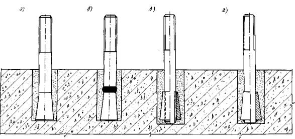 1.4. Самоанкерующиеся конические болты с зачеканкой (тип I) просты в изготовлении и не требуют жестких допусков к размерам образованных скважин. Болты этого типа рекомендуется применять для крепления оборудования и конструкций к полам, перекрытиям и фундаментам, их можно устанавливать на вертикальной поверхности.