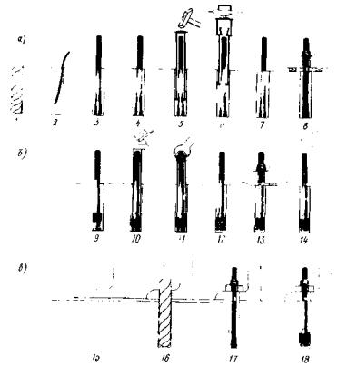 Коническая часть стержня образуется также, как и для болтов с зачеканкой (рис. 4, а-г).