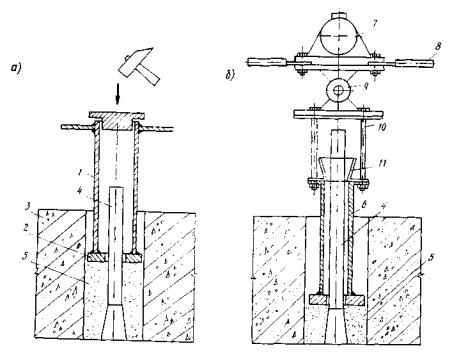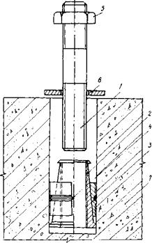 а - болты с цементной зачеканкой (тип I); б - болты с цангами (тип II) 1 - самоанкерующийся конический болт; 2 -скважина; 3 – цементная зачеканка; 4 - цанги; 5 - фундамент; 6 - закрепляемое оборудование (строительный элемент); 7 - подкладки