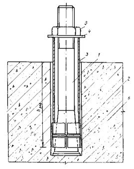 1 - болт с зачеканкой; 2 - болт с цангами; 3 - скважина; 4 - фундамент