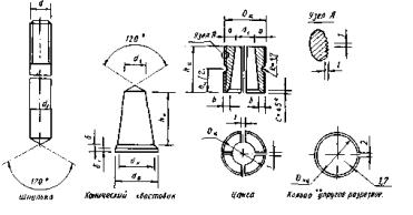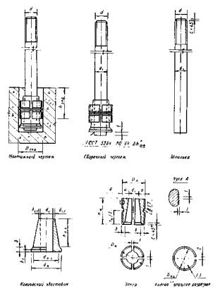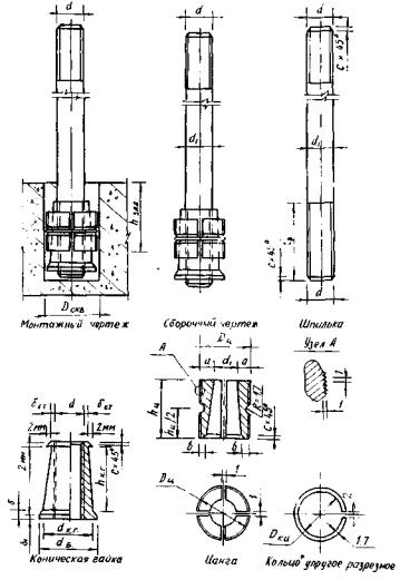 2.4. Конический болт с цангами состоит из стержня с конической нижней частью и раздвижных щек (цанг) - четырех криволинейных пластинок переменной толщины, стянутых упругим кольцом.