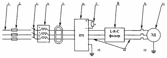 1 - кабель сети, 2 - сетевые предохранители, 3 - автоматический выключатель, 4 - сетевой дроссель, 5 - фильтр радиопомех, 6 - преобразователь частоты, 7 -тормозной резистор, 8 - синус (L-R-C) фильтр, 9 - тепловое реле, 10 - кабель двигателя, 11 - асинхронный двигатель с короткозамкнутым ротором, 12 - заземление