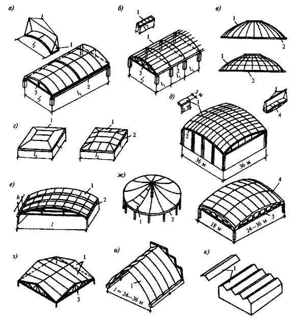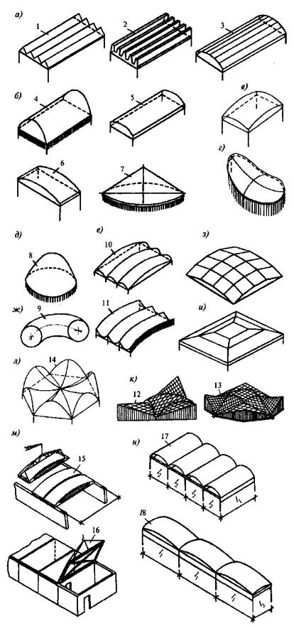а - призматические складки; б - оболочки нулевой гауссовой кривизны; в - оболочки положительной гауссовой кривизны; г - то же, отрицательной; д - оболочки с вертикальной осью вращения; е - оболочки с горизонтальной осью вращения; ж - тороидальные оболочки разнозначной гауссовой кривизны; з - многогранники; и - то же, шатрового типа; к - составные оболочки; л - то же, из гиперболических треугольных сводов; м - панели-оболочки размером на пролет покрытия (КЖС) и вспарушенные оболочки размером на ячейку здания; н - неразрезные оболочки; 1 - балочная складка с треугольным поперечным сечением; 2 - то же, с трапециевидным; 3 - то же, со сводчатым (призматические выпуклые складки); 4 - свод-оболочка; 5 - длинные цилиндрические оболочки, 6 - то же, короткие; 7 - коническая оболочка; 8 - купол; 9 - тороидальная оболочка; 10 - бочарные своды; 11 - гиперболические оболочки; 12 - покрытие с треугольным планом из оболочек положительной и отрицательной гауссовой кривизны; 13 - то же, с полигональным планом; 14 - покрытие из составных гипаров; 15 - панели-оболочки КЖС; 16 - вспарушенные плиты-оболочки; 17 - многоволновые оболочки; 18 - многопролетные оболочки