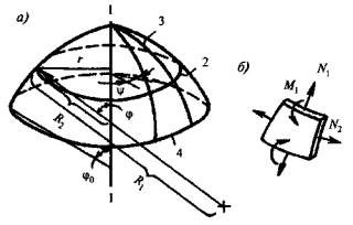 б) оболочки и своды нулевой гауссовой кривизны - цилиндрические и конические оболочки и цилиндрические своды (рис. 4.1, б);