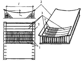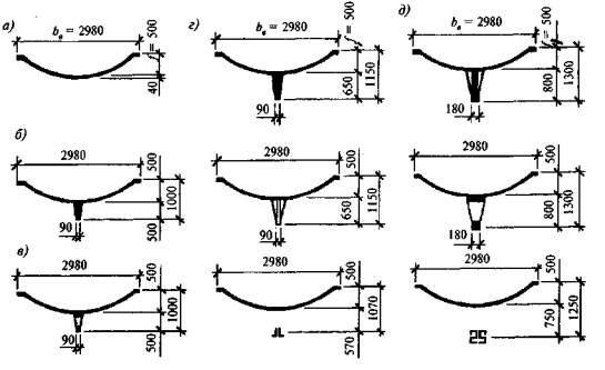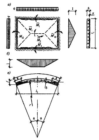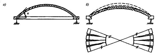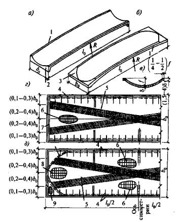 в) оболочки и волнистые своды положительной гауссовой кривизны - сферические оболочки и купола, очерченные по поверхностям вращения с вертикальной осью (рис. 4.1, д); оболочки, очерченные по поверхности переноса в виде эллиптического параболоида, круговой поверхности (рис. 4.1, в) и бочарные своды (рис. 4.1, е, 10);