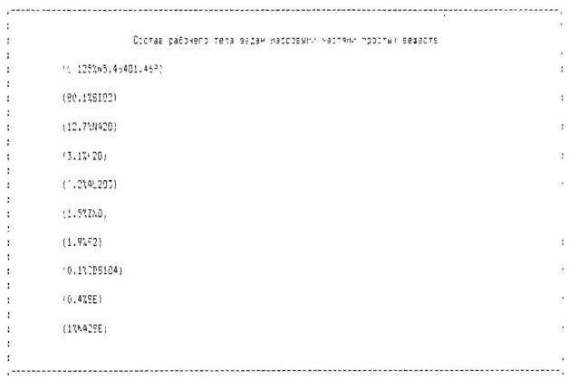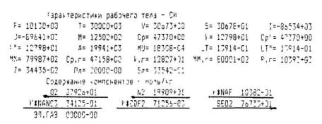 Этот материальный баланс закладывается как исходные данные в программу расчета на ЭВМ равновесного состава. В исходные данные входят также давление и температура в печи. Нормальному атмосферному давлению 760 мм рт.ст. соответствует 0,1013 МПа. Температура в печи в Кельвинах должна быть известна из технологического процесса. Из распечатки результатов (см. Приложение) выписывается массовая доля конденсированных компонентов рабочего тела (параметр Z на распечатке) и равновесный состав газовой фазы печного пространства Mi; в молях на килограмм рабочего тела. Газообразные компоненты отличаются от конденсированных тем, что у последних химическая формула начинается с символов K* . Выписывать необходимо только те газообразные компоненты, содержание которых достаточно велико, например Mi > 0,1×10-4. Указанные данные записываются в первый и второй столбцы таблицы 2, форма которой приведена ниже.