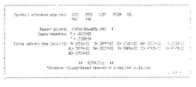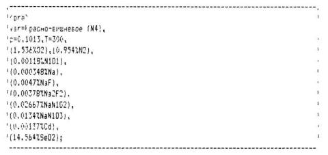 Расчеты параметров равновесного состояния являются составной частью процедуры определения выбросов в атмосферу газообразных загрязняющих веществ по настоящей методике. Расчеты проводятся по программе для ЕС ЭВМ или ППЭВМ типа IBM PC/AT. Программа снабжена базой данных, в которой хранится информация для вычисления термодинамических свойств индивидуальных химических компонентов. Обе версии программы (для ЕС ЭВМ и ППЭВМ типа IBM PC/AT) поставляются разработчиками методики на магнитных носителях вместе с необходимой документацией и базой данных. Поставка программы производится на договорных условиях. В случае нецелесообразности приобретения программы необходимые термодинамические расчеты выполняются разработчиками методики также на договорных условиях. В качестве исходных данных задаются элементный состав шихты или, что то же самое, ее исходный компонентный состав с указанием условной химической формулы каждого компонента. Элементный состав определяется потоками массы сырья в зону печи, условиями вентиляции и другими условиями технологического процесса при высокотемпературной обработке. Вторым видом исходных данных являются два термодинамических параметра, чаще всего это давление и температура или давление и энтальпия, в зависимости от того, входит ли температура в число определяемых параметров.