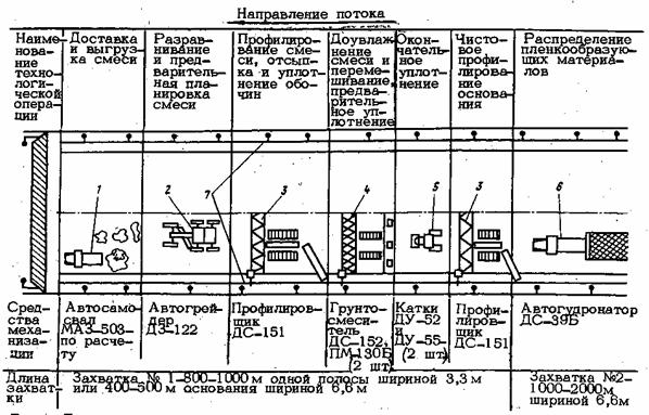 1.6. Рационально специализировать строительные организации на выполнение следующих видов работ: подготовительные и возведение земляного полотна, устройство оснований и покрытий с применением комплекта машин ДС-150. В этом случае первым организациям может быть придан упрощенный комплект ДС-150 с одной ведущей машиной - профилировщиком-распределителем ДС-151, а вторым - полный комплект ДС-150 с профилировщиком ДС-151 и однопроходной грунтосмесительной машиной ДС-152.