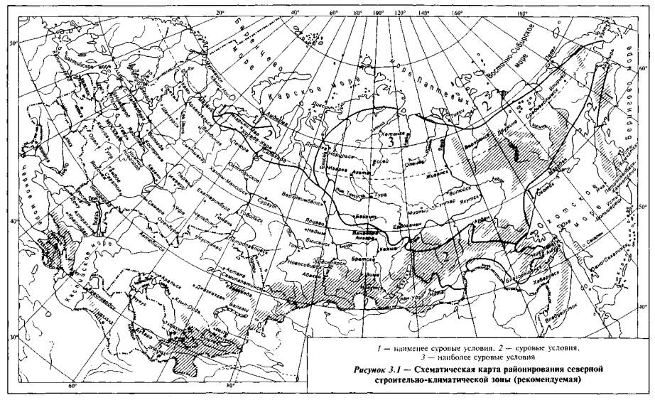 3.4 Северная строительная климатическая зона (рис. 3.1) подразделяется на три климатических района с условиями: 1 - наименее суровыми; 2 - суровыми; 3 - наиболее суровыми (табл. 3.1).