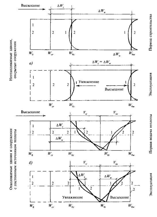 1 - действительное распределение влажности бетона; 2 - расчетное распределение влажности бетона; W0 - начальная влажность бетона W0 > Wcr; Wcr - критическая влажность бетона, с уменьшением которой развиваются деформации усадки; W0c, W0w - равновесная влажность сечения или грани бетона в холодное (январь) и теплое (июль) время года; W0i - равновесная влажность грани бетона, находящегося в закрытом помещении; ΔWc, Vic и ΔWw, Viw - изменение средней равновесной влажности и перепада влажности по сечению соответственно в холодное и теплое время года