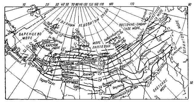Изолинии глубин сезонного оттаивания глинистых грунтов