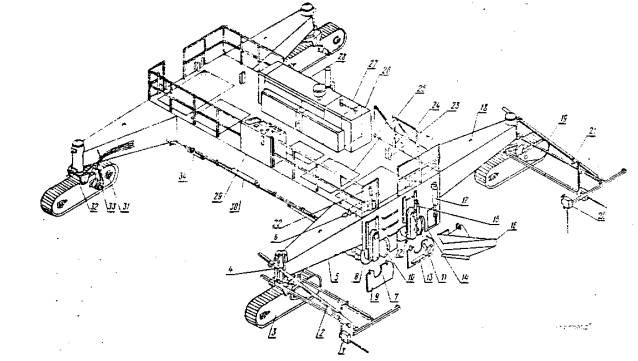 1 - датчик уровня с копиром 2 - укосина 3 - гусеничный двигатель 4 - гидроцилиндр подъема ноги 5 - нога рамы 6 - погрузочный гидроцилиндр 7 - узел привода фрезы 8 - фреза 9- дверца фрезы 10 - передний отвал 11 - узел привода шнека 12 - шнек 13 - заслонка 14 - задний отвал 15 - гидроцилиндр заслонки 16 - уширитель отвала 17 - гидроцилиндр отвала |