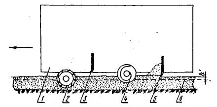 1 - главная рама; 2 - фреза; 3 - передний отвал; 4 - шнек; 5 - задний отвал; 6 - проектная поверхность земляного полотна; - запас на уплотнение и на срезку при чистовой планировке земляного полотна.