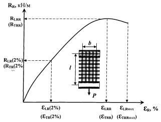 RLR(e) - усилие в образце в направлении длины материала, отнесенное к ширине образца, возникающее при определенной относительной деформации e (в данных Рекомендациях при e = 2 %, см. Приложение БII), кН/м.