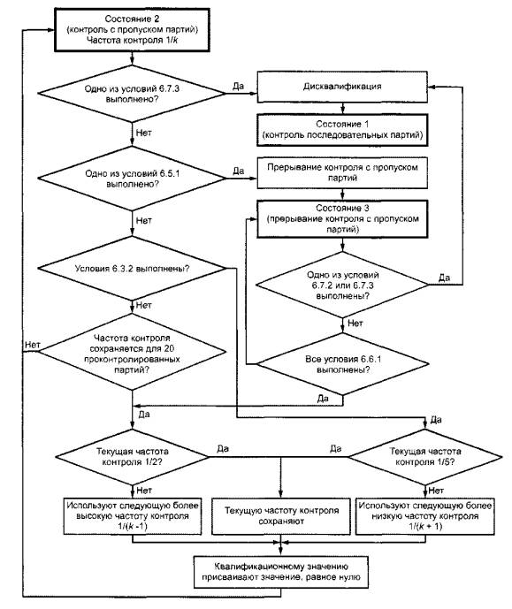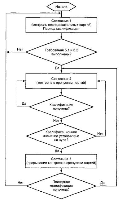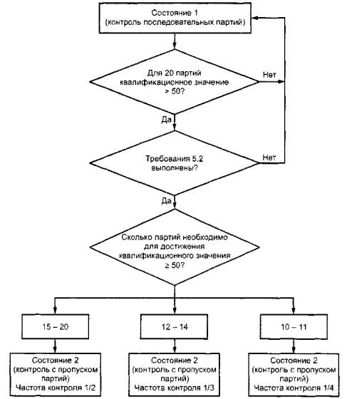 Примечание 2 - В соответствии с настоящим стандартом контроль последовательных партий используют как в состоянии 1 (период квалификации), так и в состоянии 3 (прерывание контроля с пропуском партий) (см. 5.1).
