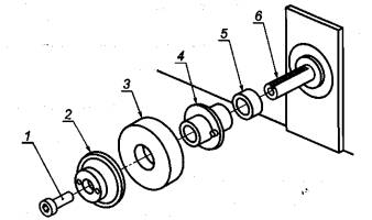 1 - предохранительный винт; 2 - держатель прокладки; 3 - испытательное кольцо; 4 - адаптер испытательного кольца; 5 - распорка; 6 - ведущий вал