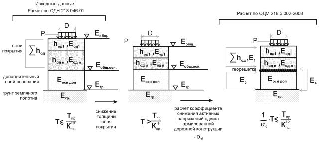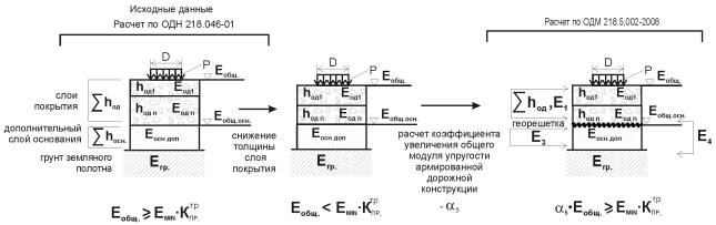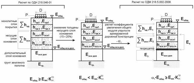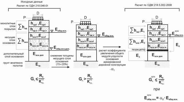2. По ОДН 218.046-01 проводим расчет для неармированной дорожной конструкции по определению общего модуля упругости на поверхности несущего слоя основания под монолитными слоями из асфальтобетона, общего модуля упругости на поверхности основания подстилающего композитный слой «зернистый материал + георешетка».