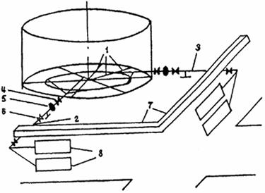 1 - внутренняя разводка трубопроводов в резервуаре; 2 - линейный ввод-1; 3 - линейный ввод-2; 4 - коренная задвижка; 5 - разрывная мембрана; 6 - обратный клапан; 7 - обвалование; 8 - высоконапорные пеногенераторы