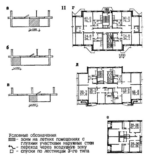 II - в секциях с незадымляемой лестничной клеткой 2-го типа: г - лестница 3-го типа при лестнично-лифтовом холле и летние помещения с глухими участками наружных стен в квартирах (серия Пд4); д - поэтажные переходы по балконам и лоджиям из квартир в смежную секцию через воздушную зону (серия П44); е - спуски по лестницам 3-го типа из квартир в торцах секции (серия П3О).