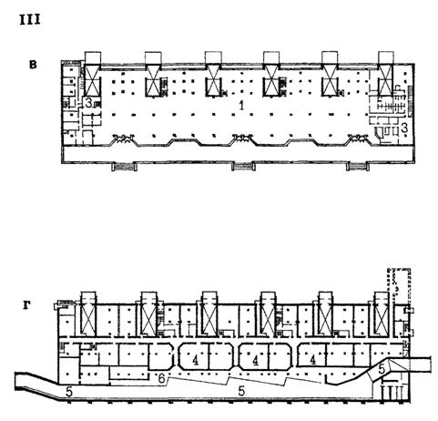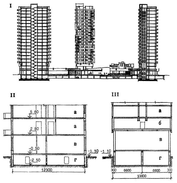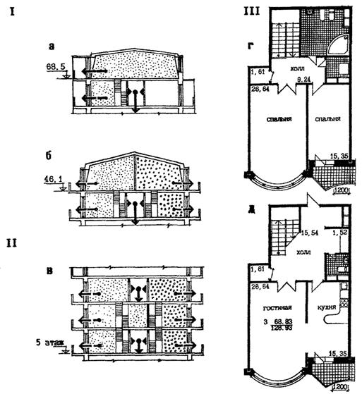 III - пример решения квартиры в двух уровнях (МНИИТЭП. М2. Проектное предложение. Архитектор: Калашникова И.); г - план верхнего уровня; д - план нижнего уровня.
