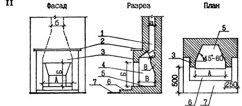 1 - дымосборник; 2 - каминная доска; 3 - портал камина; 4 - топливник; 5 - под камина; 6 - предтопочная площадка; 7 - предтопочный лист; А - ширина портала; Б - высота портала; В - глубина топливника; Г - высота горловины; а - глубина сечения трубы; б - ширина сечения трубы.