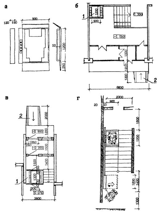 а - в одноуровневой квартире; б, в - в двухуровневой квартире; г - в трехуровневой квартире.