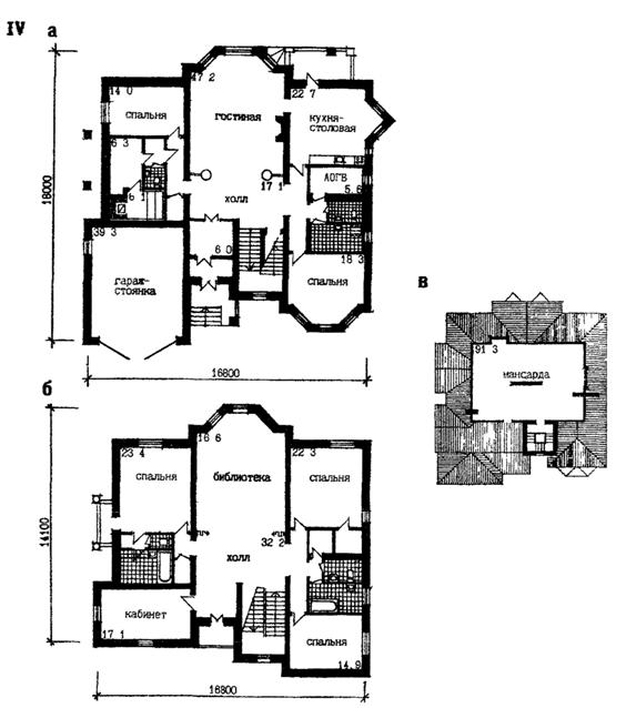 IV - одноквартирный жилой дом (Архитекторы Панченко А.): а - план 1-го этажа, б - план 2-го этажа, в - план мансарды.