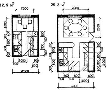В зависимости от планировочной организации кухни (ее размеров и пропорций), а также состава и габаритов оборудования рабочий фронт приготовления пищи может размещаться: у одной из стен (однорядное размещение); у двух смежных стен (угловое размещение); у двух противоположных стен (двухрядное размещение). Допускается также П-образное размещение оборудования.