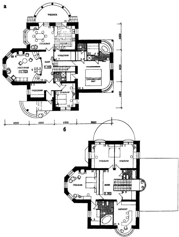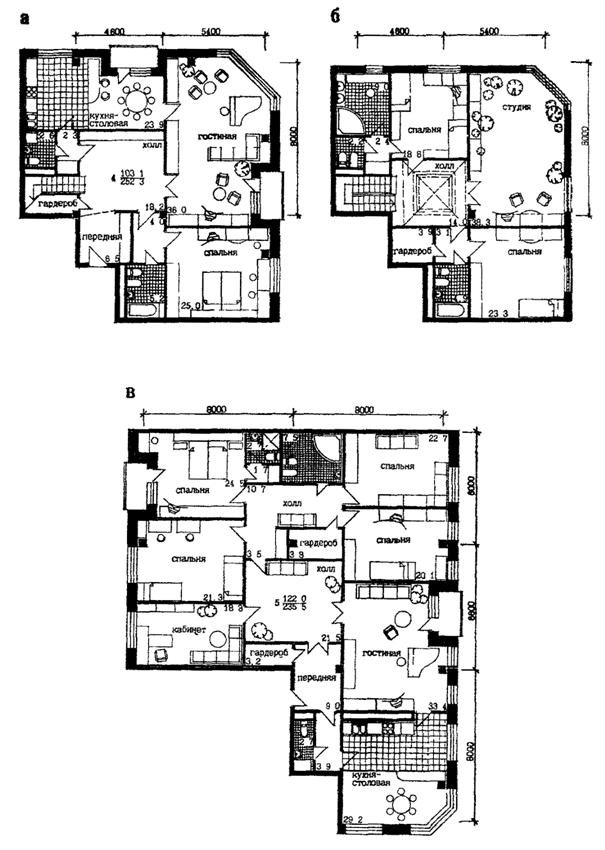 I - планы квартир жилой части комплекса школы оперного искусства Г. Вишневской по ул. Остоженка (Управление Моспроект-2, М18. Руководитель авторского коллектива Посохин М., архитекторы Плеханов М. и Левитина А); а - план нижнего уровня 4-комнатной квартиры, б - план верхнего уровень 4-комнатной квартиры, в - план 5-комнатной квартиры.