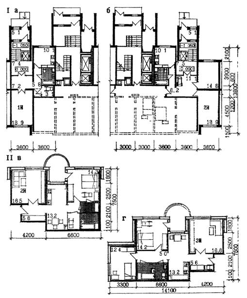 II - в жилом комплексе с обслуживанием и центром реабилитации для молодых инвалидов (МНИИТЭП, М2, стадия "проект". Архитекторы Дадья В., Полетаев Ю. и другие): в - 2-комнатная квартира; г - 3-комнатная квартира.