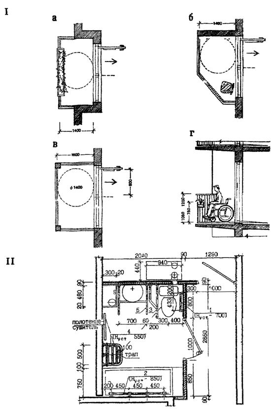 4.20. Оборудование санитарных узлов должно предусматривать возможность перемещения инвалида с кресло-коляски в ванну и на унитаз (рис. 42 г). С этой целью устанавливаются поручни, штанги, поворотные (или откидные) сиденья или гидравлические подъемники, а отметка верха унитаза от уровня пола принимается равной 0,5 м.