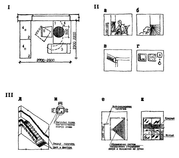 Рис. 43. Примеры оборудования в жилище для слепых и средства ориентирования.
