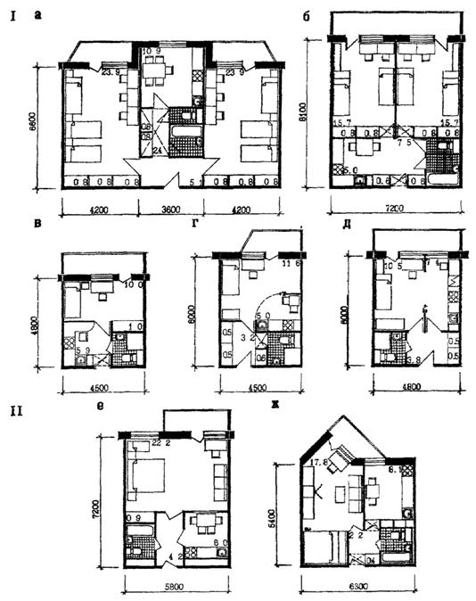 I - для одиночек: а - на 6 человек; б - на 4 человек; в, г, д - на одного человека.